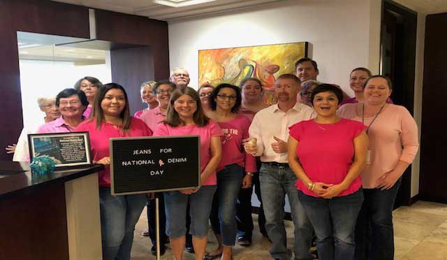 Jaburg Wilk employees sported pink shirts and denim pants for the 2018 Lee National Denim Day. They donated $5, which the firm matches, to support breast cancer charities. This year the proceeds will be donated to Cancer Support Community of Arizona. The firm has participated in this breast cancer fundraising program for several years.