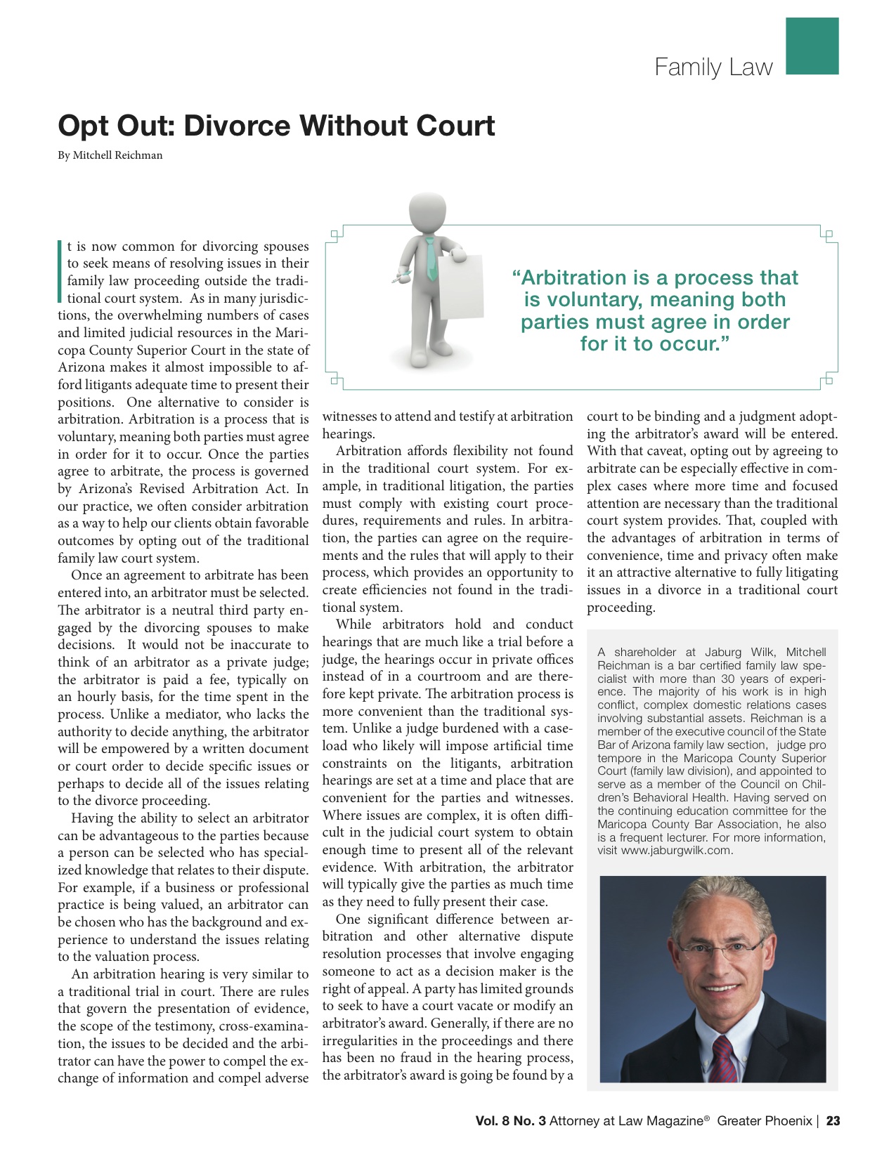 Mitchell Reichman is an Arizona State Bar board certified family law specialist and partner at the Phoenix law firm of Jaburg Wilk. Mitch is experienced in representing clients in high-conflict divorces.